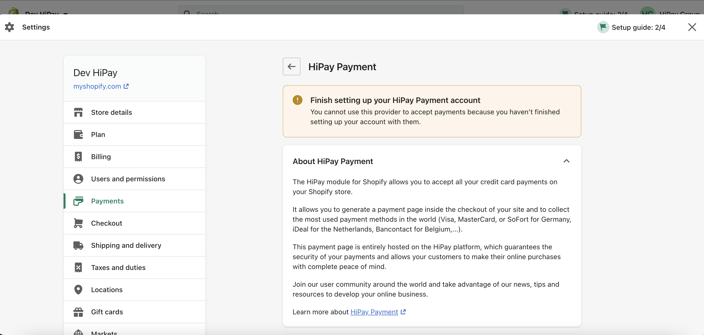 The process to add HiPay as your Gateway for your Shopify Store is the following one: