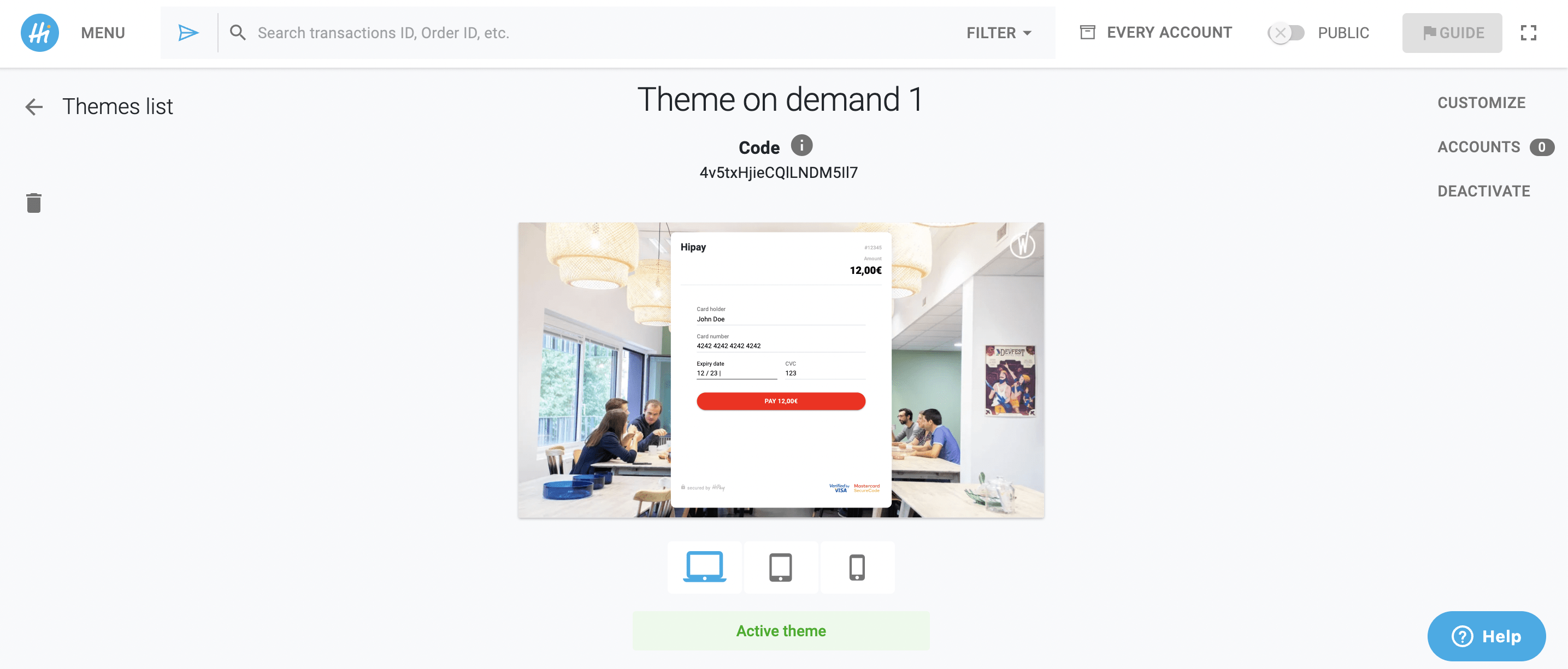 - Active Themes (by default): Themes that are linked to one or more HiPay Accounts. It is the default theme for your account(s)